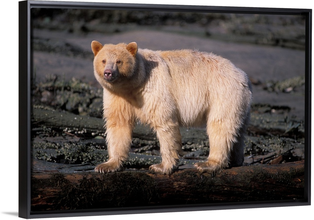 <p>spirit bear, Kermode, black bear, Ursus americanus sow walking on a log, central British Columbia coast, Canada</p>