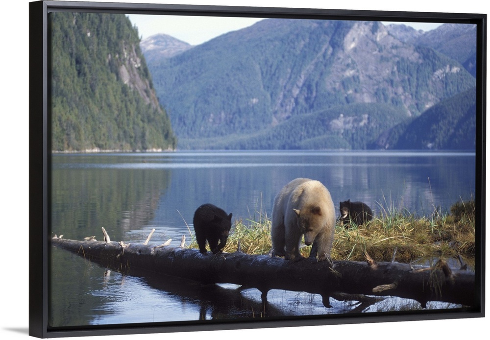 <p>spirit bear, kermode, black bear, Ursus americanus, sow with cubs fishing and feeding on salmon, central British Columbia coast, Canada</p>