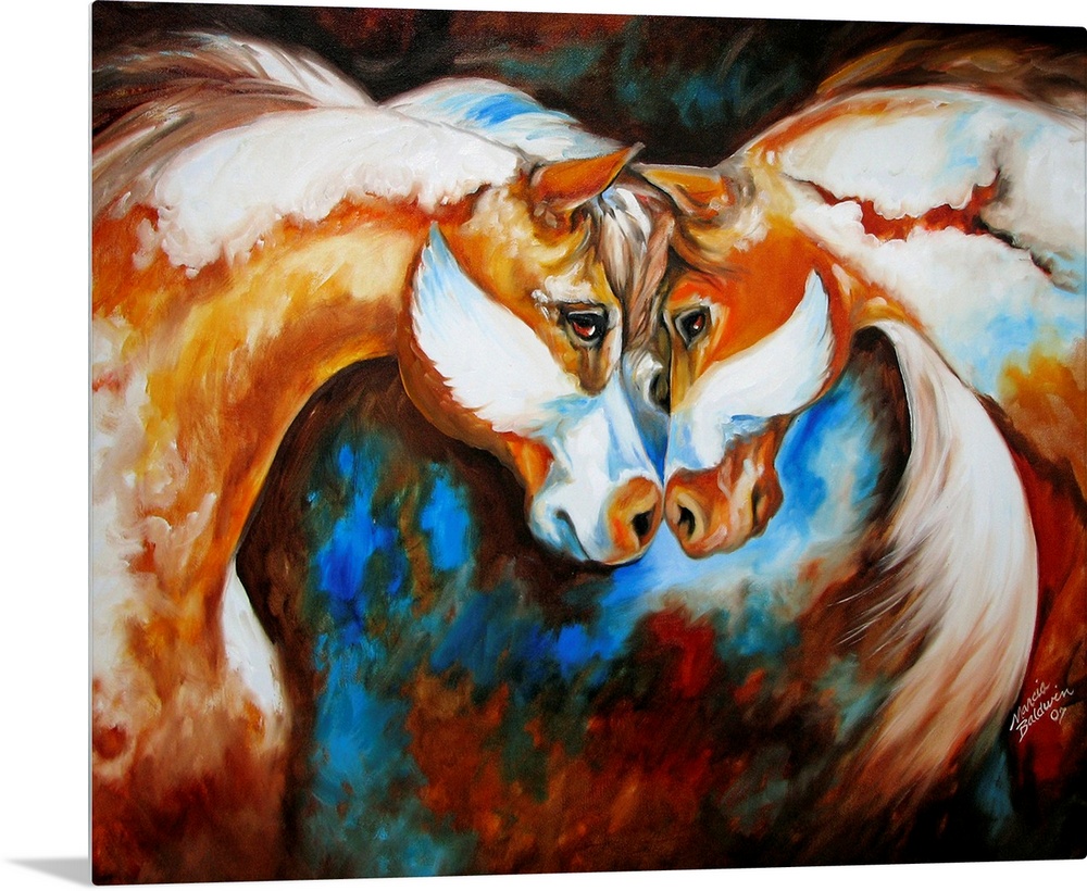 <p>The Equine Spirit is captured with the boldness and bravery of the eagle soaring on high, an image suggested by the coloration pattern of the two horses nose to nose.</p>