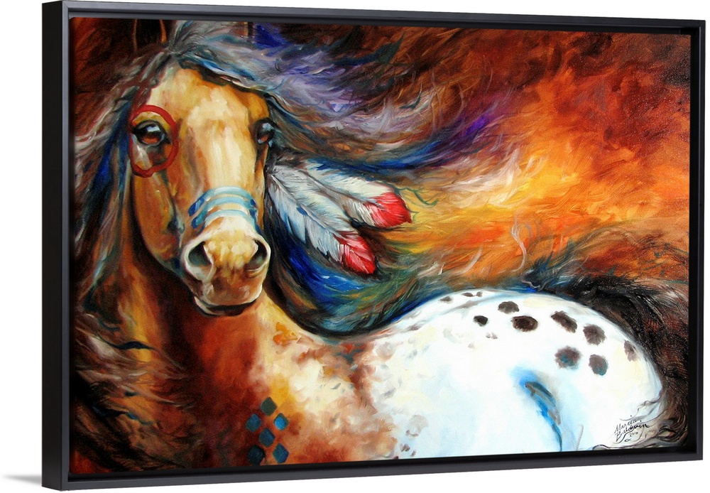 <p>Contemporary painting depicting the bold spirit of the equine appaloosa with feathers in its mane and war paint all over its body.</p>