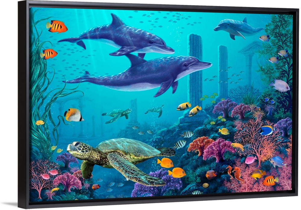 <p>Big, horizontal artwork of underwater remnants of Atlantis, surrounded by vibrant coral and tropical fish, as well as several sea turtles and dolphins.</p>