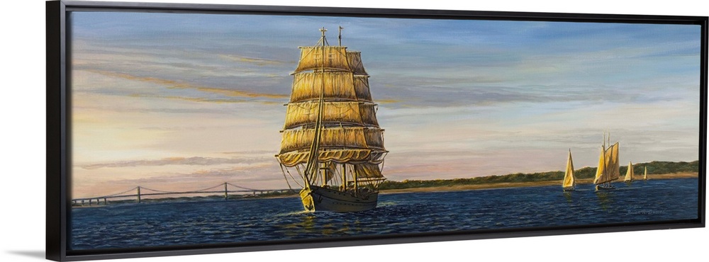 <p>Contemporary artwork of a ship with several smaller boats in the back and bridge in distance.</p>