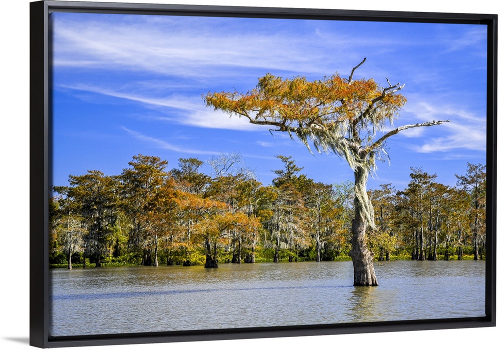 <p>A Spanish moss-draped cypress tree stands alone in the Atchafalaya Basin's Grand Lake. The tree, which has begun turning autumn gold, is an iconic symbol of South Louisiana's extensive swamps.</p>