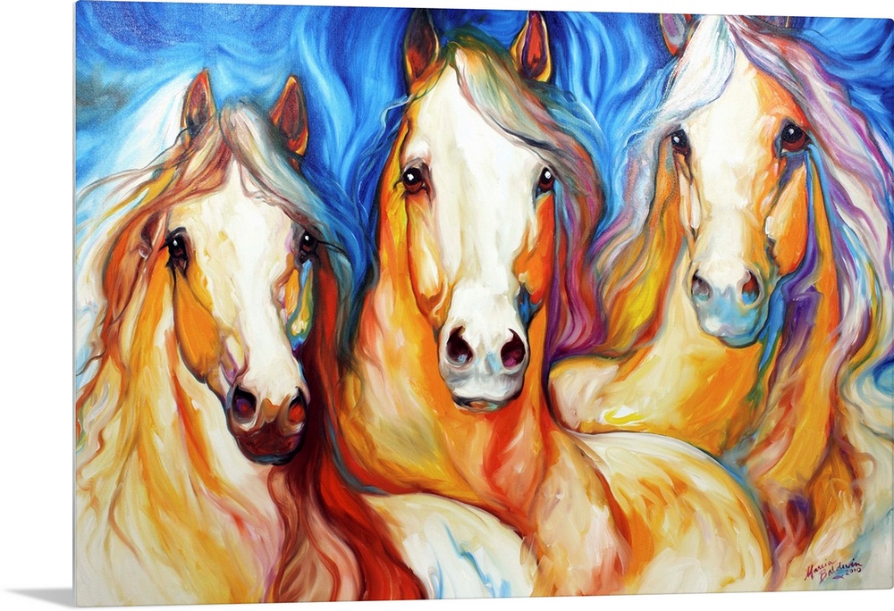 <p>Contemporary painting of three light brown horses with flowing manes on a blue background.</p>