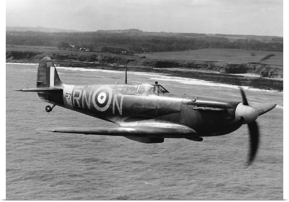 <p>A Spitfire in flight of the coast of Britain during World War II.</p>