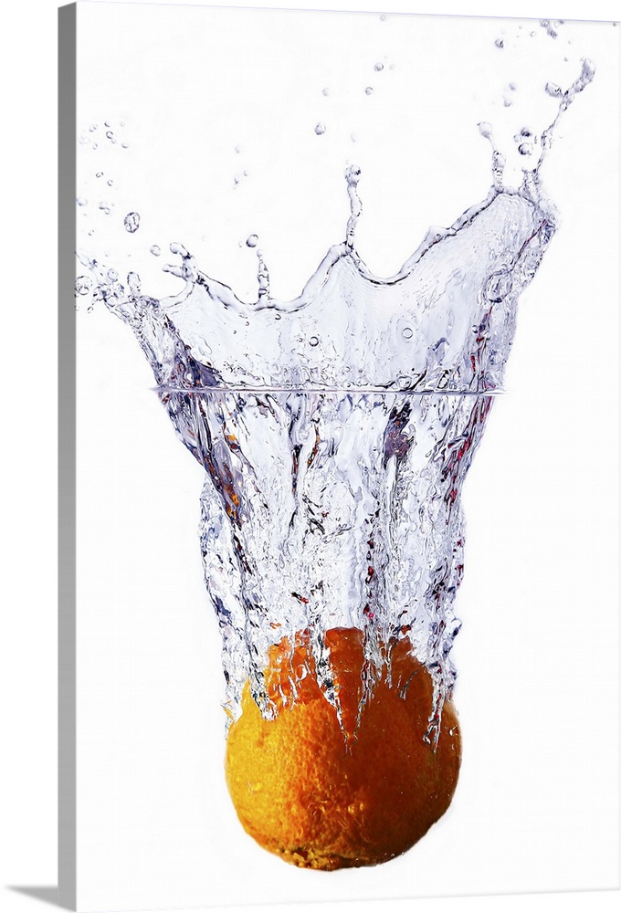 <p>Orange falling into a glass of water creating a splash.</p>