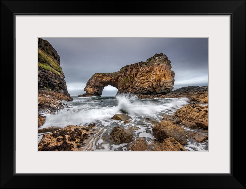 <p>Oceanwater splashing onto the rocky shores in Ireland, with a natural bridge formation in the distance.</p>