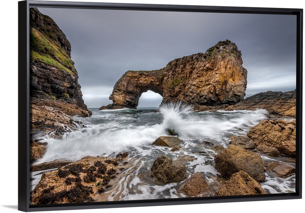 <p>Oceanwater splashing onto the rocky shores in Ireland, with a natural bridge formation in the distance.</p>