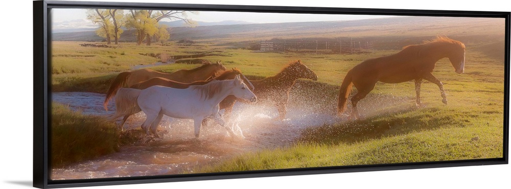 <p>Photograph of horses crossing a river in the middle of a field at sunset.</p>