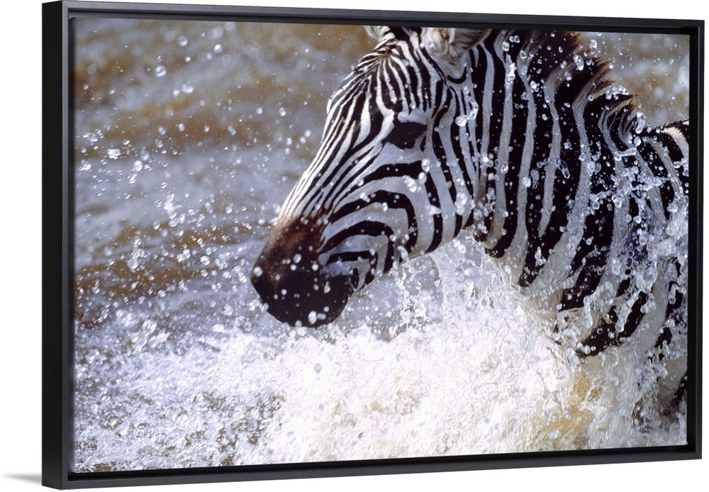<p>Photograph of a zebra running through a body of water as drops of water shoot upward.</p>