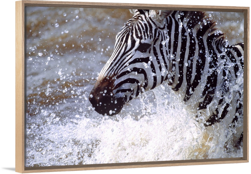 <p>Photograph of a zebra running through a body of water as drops of water shoot upward.</p>
