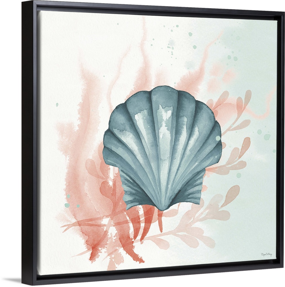 <p>Watercolor painting of a seashell and seaweed in blue and coral hues on a square background.</p>