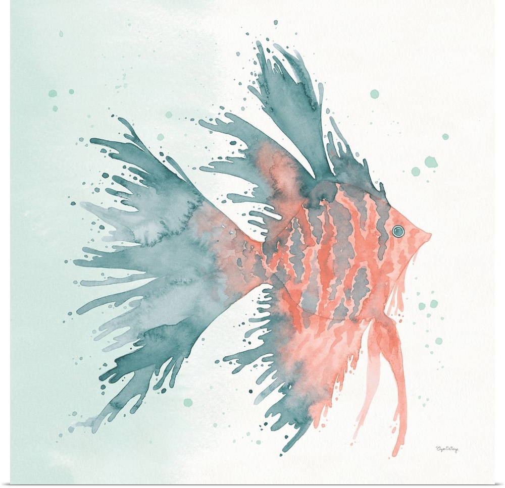 <p>Watercolor painting of a tropical fish in blue and coral hues on a square background.</p>