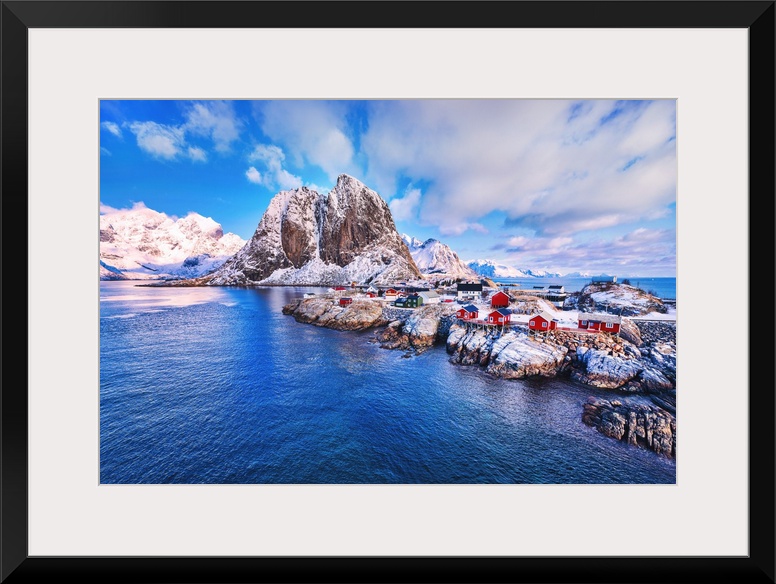 <p>A fjord in Norway with a fishing village and red wooden cottages</p>
