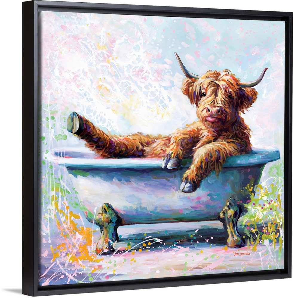 <p>Playful artwork of a baby highland cow relaxing in a vintage clawfoot bathtub.</p>