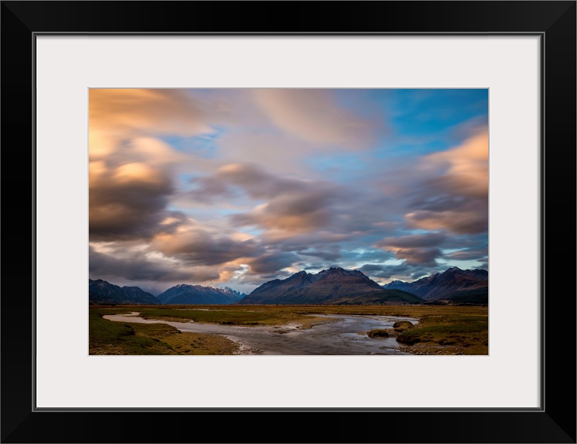 <p>Landscape photograph with a stream splitting in the middle of a field with mountains in the background.</p>