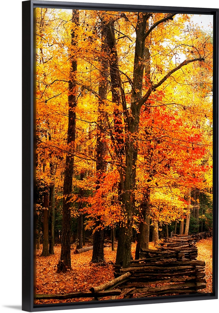 <p>Handmade log fence in a jagged pattern lines the forrest as autumn leaves create a blanket of brilliant colors on the ground.</p>