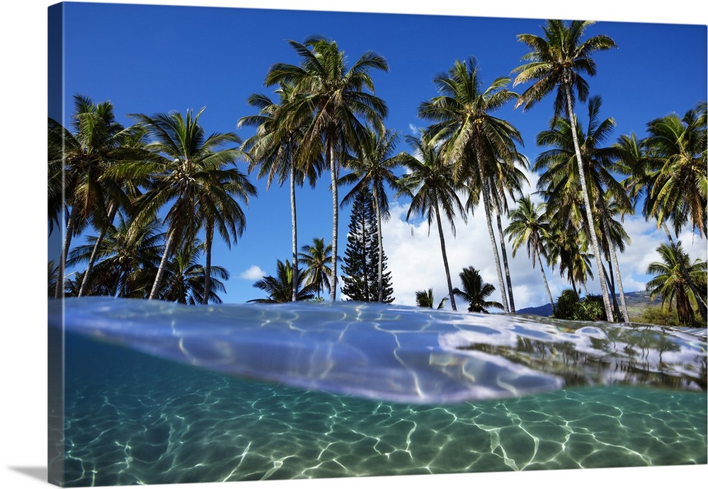 <p>Split view with ocean and palm trees; Lanai, Hawaii, United States of America</p>