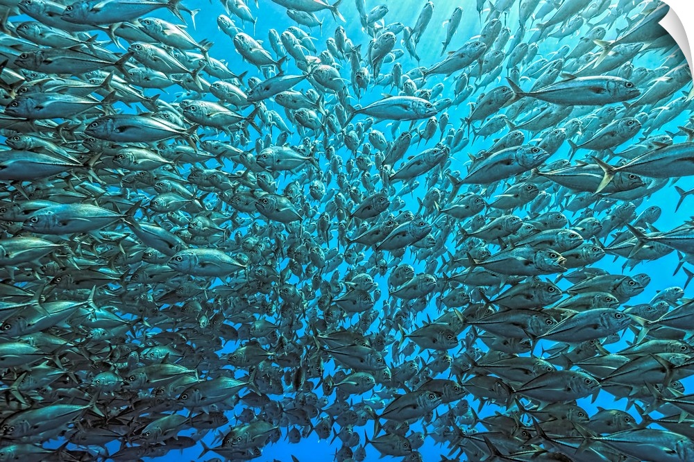<p>Schooling Jackfishes (Bigeye Trevally, Caranx sexfasciatus) split and rush frontally towards the underwater photographer. Taken around the Island Balicasag near Bohol, Philippines.</p>