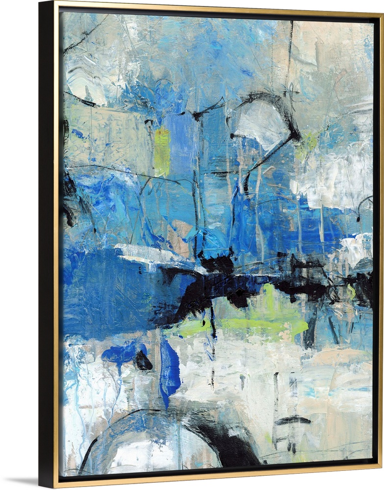 <p>This abstract piece of artwork shows multiple techniques of painting with a cool color palate.</p>