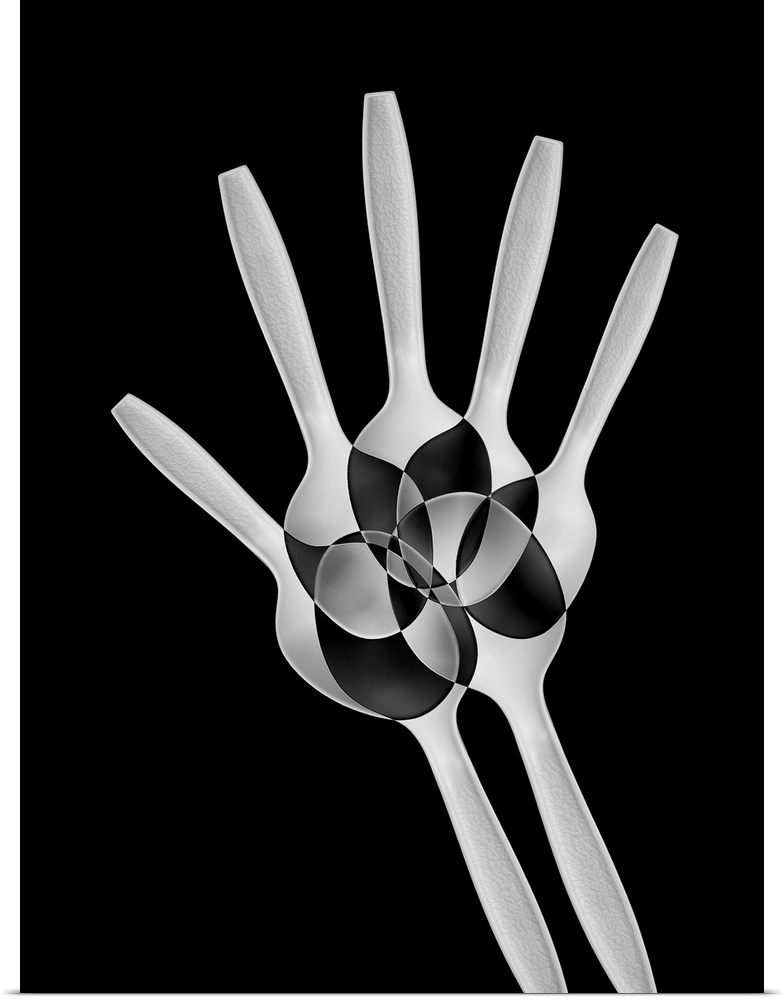 <p>Abstract image of plastic spoons arranged to resemble the bones of a hand.</p>
