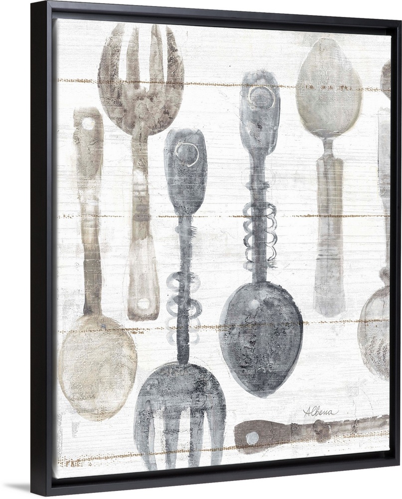 <p>Decorative artwork featuring watercolor cutlery against white shiplap.</p>