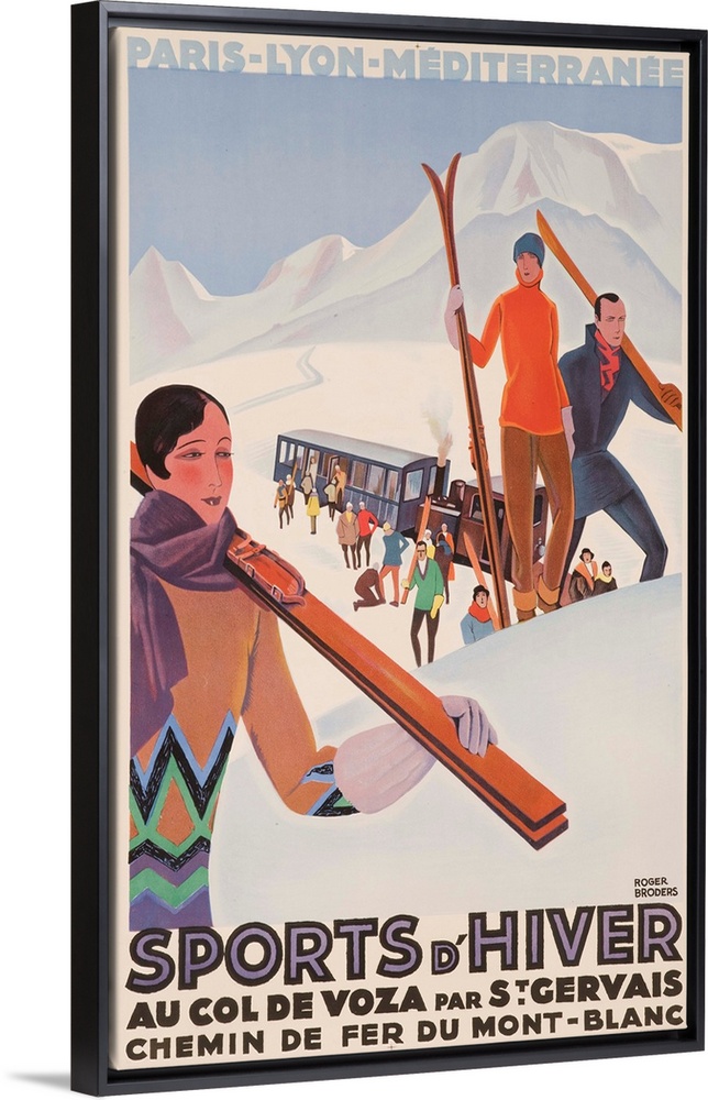 <p>ca 1930s French ski poster illustrated by Roger Broders, stylish skiers disembark from snow train at top of Col de Voza pass in Mt Blanc</p>