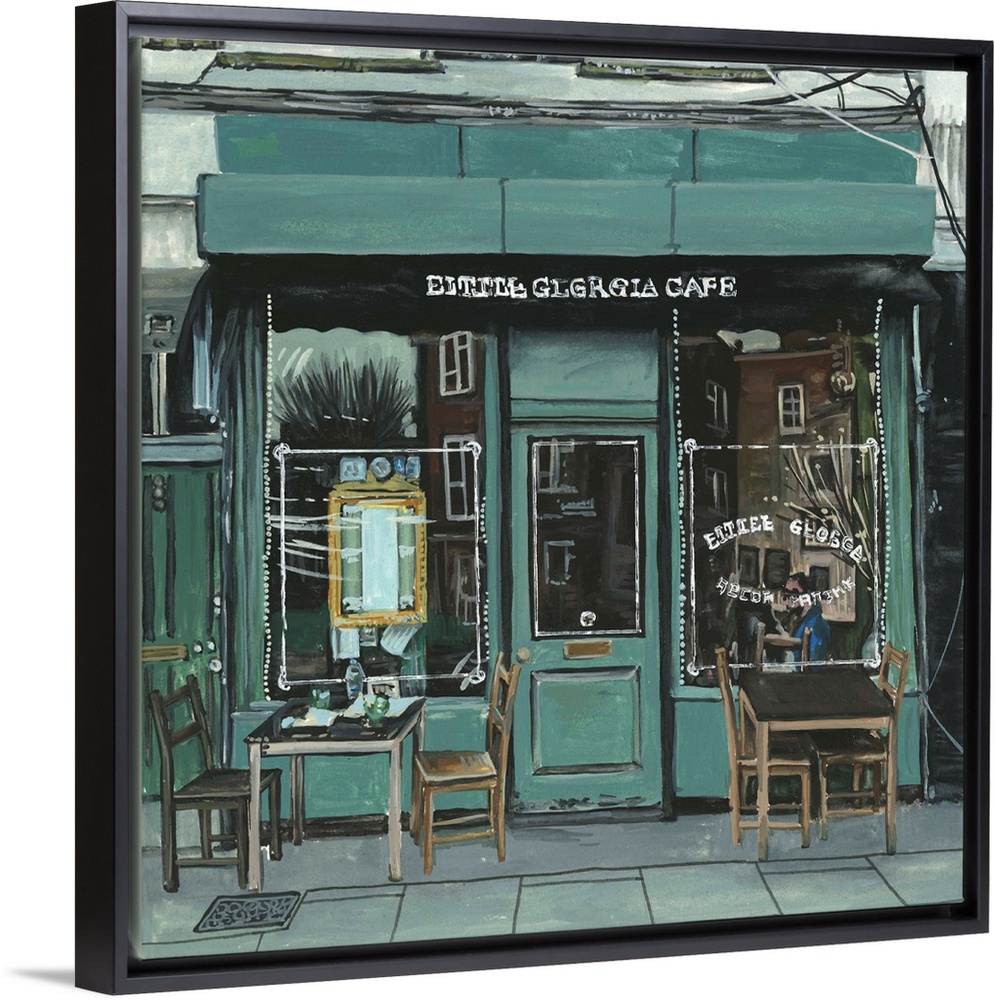 <p>A square decorative image of tables and chairs outside a teal painted cafe in France.</p>