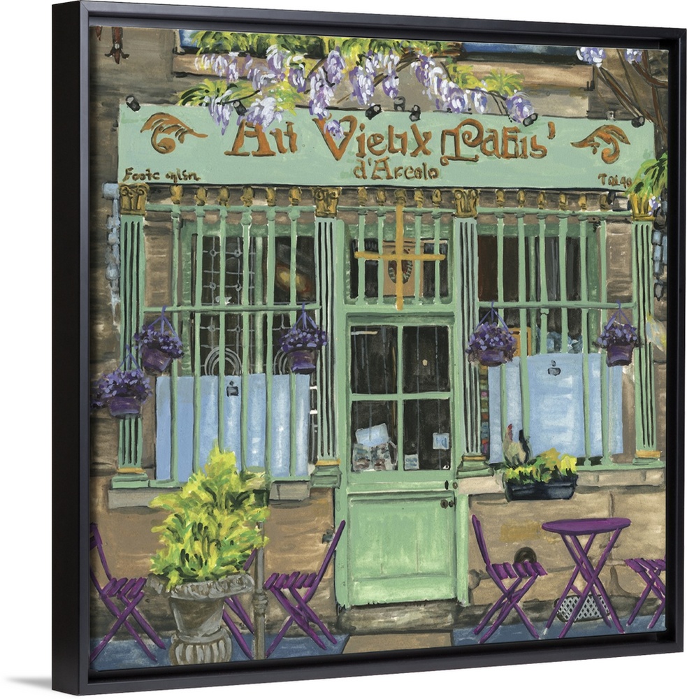 <p>A square decorative image of tables and chairs outside a green and purple painted cafe in France.</p>