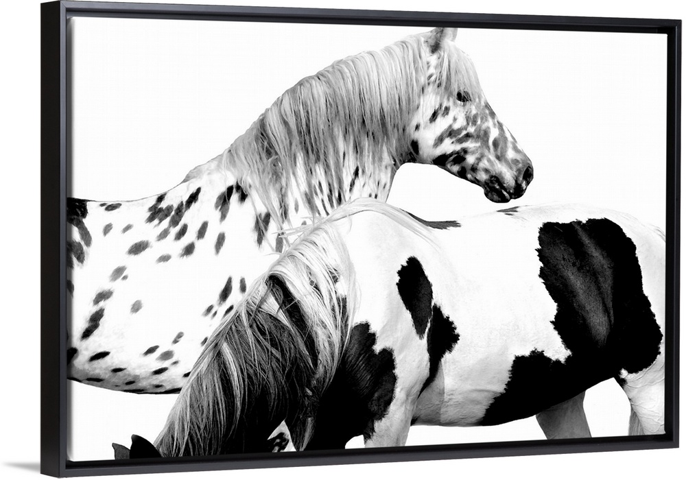 <p>Black and white image of two spotted horses on a white background.</p>