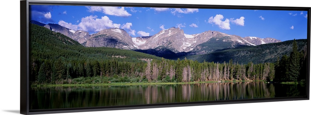 <p>Long exposure of a body of water at the base of a mountain range, edged with a pine forest, under a partly cloudy sky in Colorado.</p>