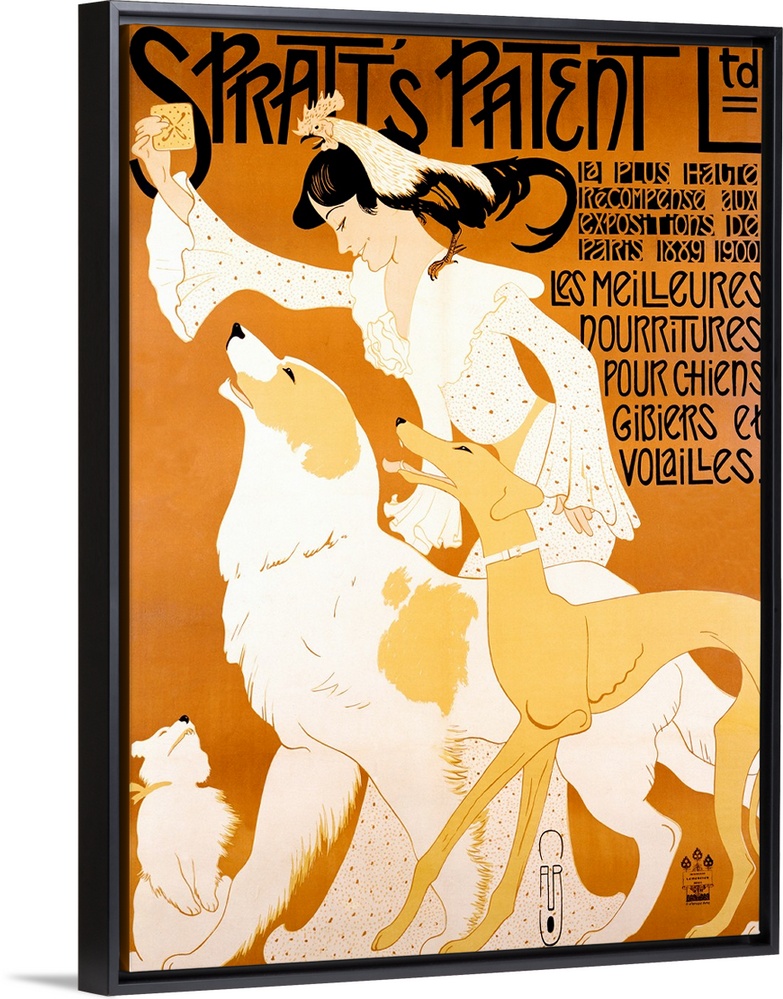<p>Vertical, large vintage advertisement for the dog food, Spratts Patent Ltd with French text below the title. An illustration of a woman in a dress, with a chicken on her shoulder, holding a dog biscuit in the air above three waiting dogs of various breeds.</p>