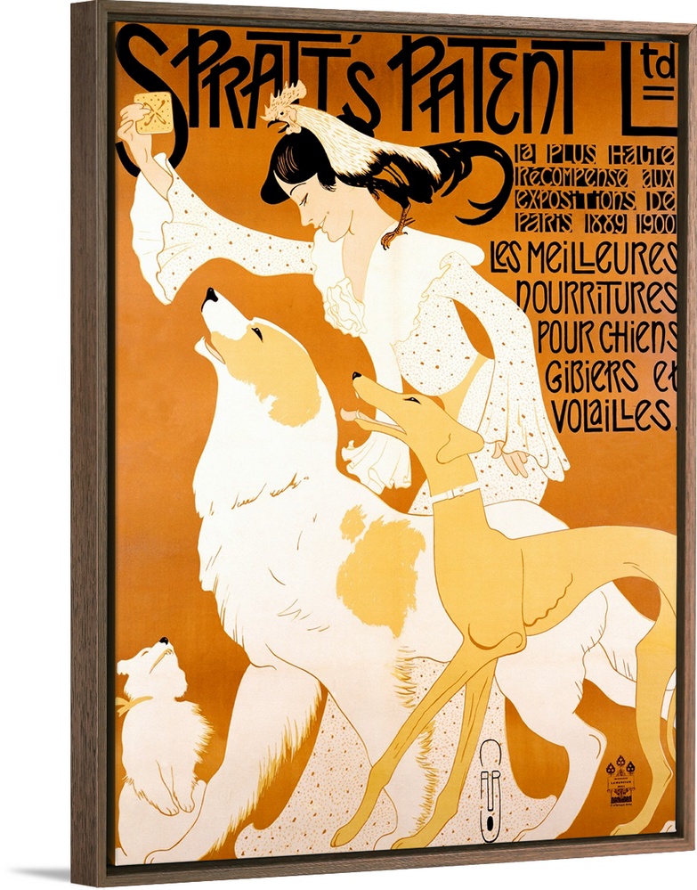 <p>Vertical, large vintage advertisement for the dog food, Spratts Patent Ltd with French text below the title. An illustration of a woman in a dress, with a chicken on her shoulder, holding a dog biscuit in the air above three waiting dogs of various breeds.</p>