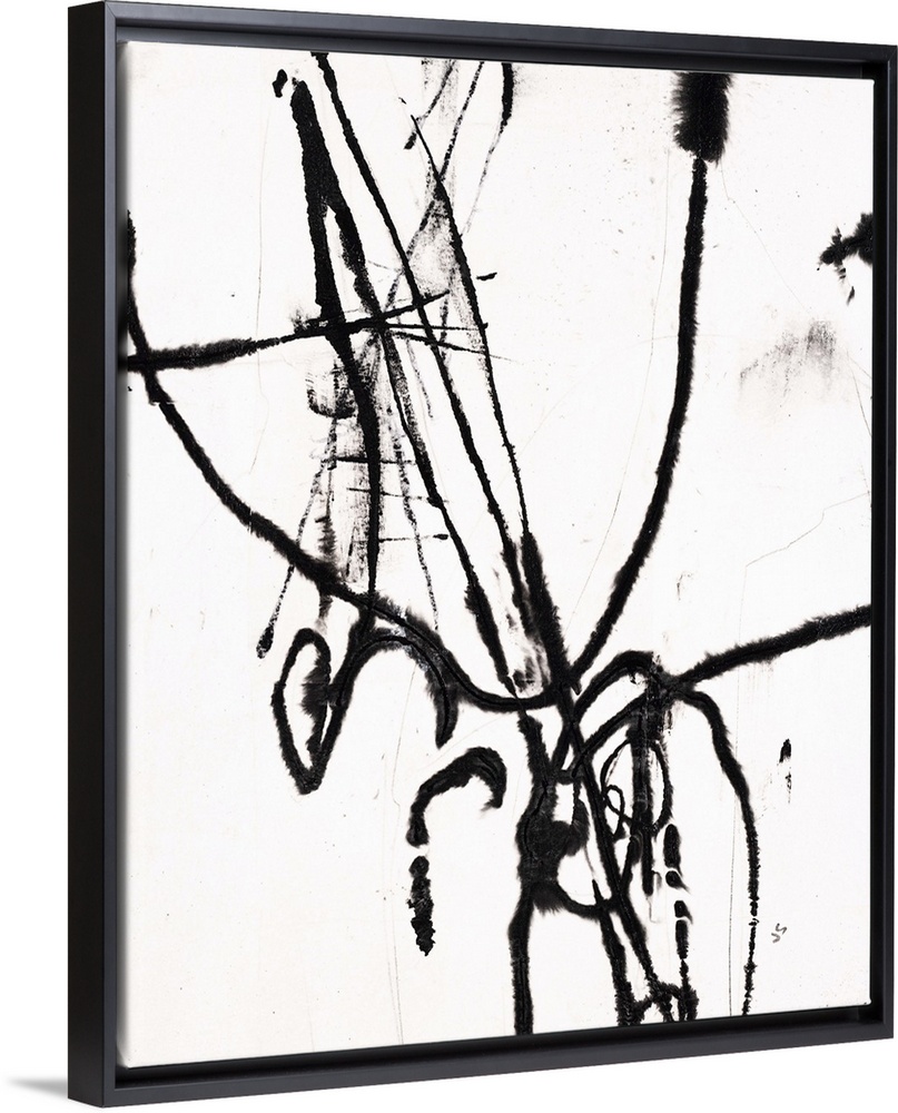 <p>Contemporary abstract painting using bold black lines against a white surface.</p>
