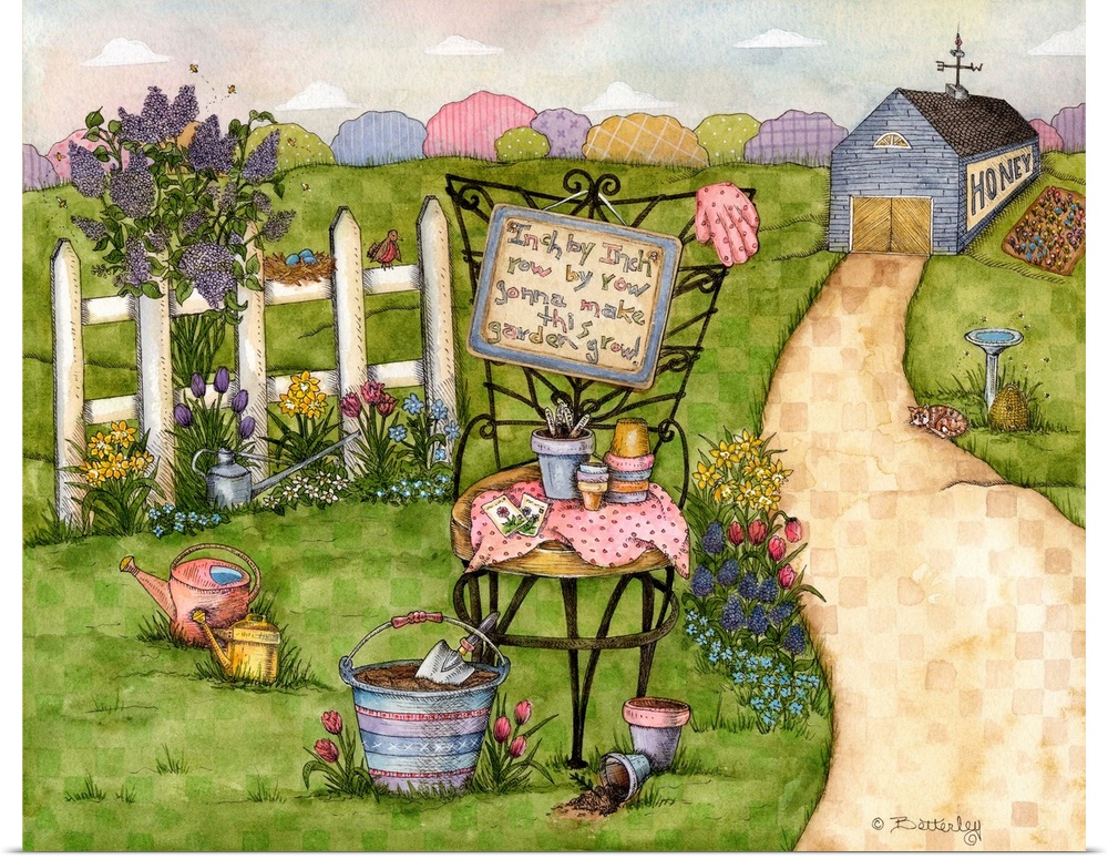 <p>Barn with path leading to fence with lilacs, daffodils and tulips. Bird with bird nest and eggs, watering can, bucket and trowel and chair with pots and seeds and gardening glove and sign that reads: inch by inch row by row someone make this garden grow.</p>
