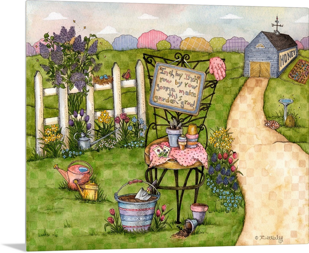 <p>Barn with path leading to fence with lilacs, daffodils and tulips. Bird with bird nest and eggs, watering can, bucket and trowel and chair with pots and seeds and gardening glove and sign that reads: inch by inch row by row someone make this garden grow.</p>