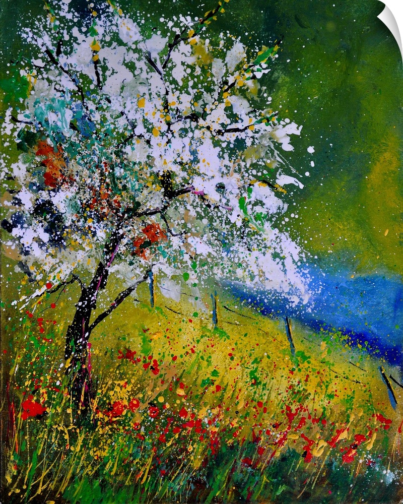 <p>Vertical painting of a tree covered in white blooming flowers along a field of wild flowers on a spring day.</p>