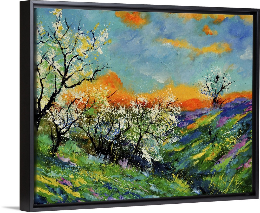 <p>Vibrant colored springtime scene of a field of blooming flowers and trees with a bright orange/blue colored sky.</p>