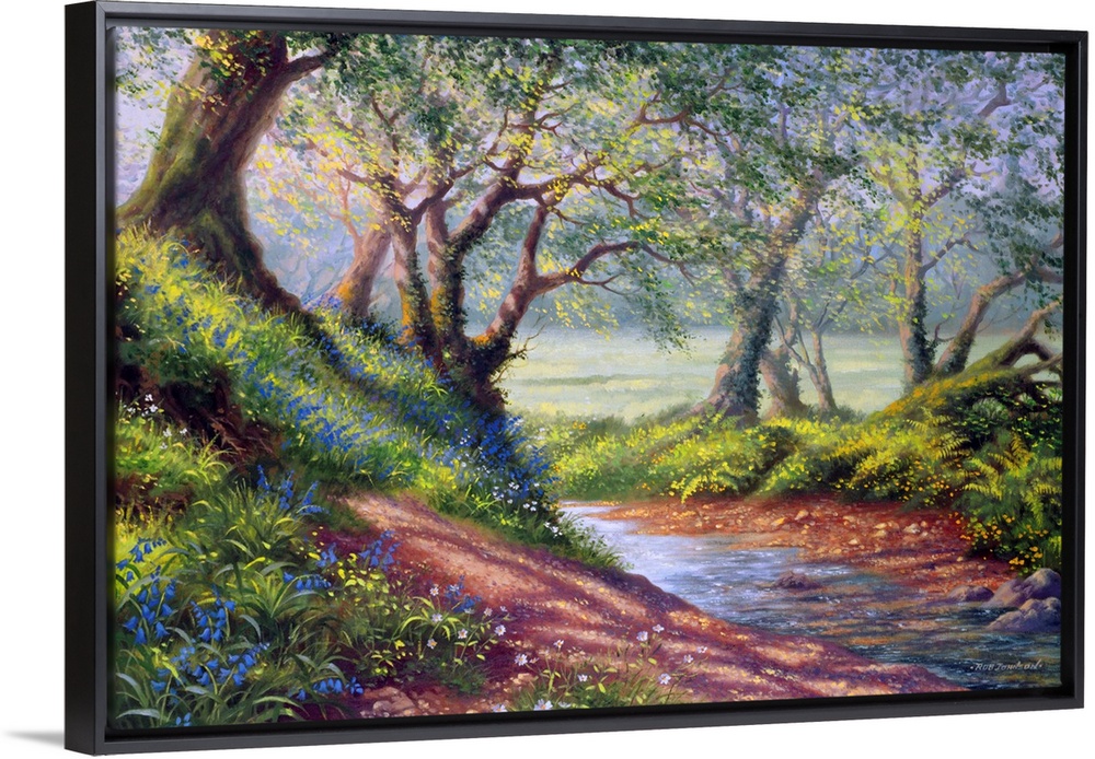 <p>Contemporary painting of a stream running through a forest.</p>