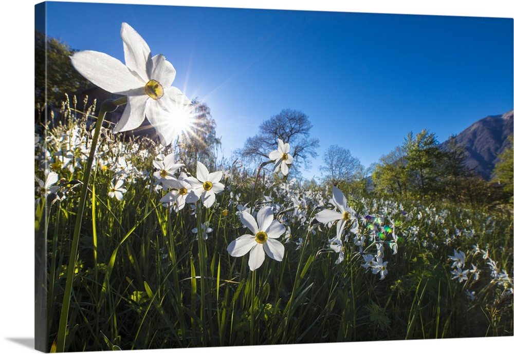 <p>Sun shines on daffodils in bloom on green fields of the Orobie Alps, Dossa, province of Sondrio, Valtellina, Lombardy, Italy</p>