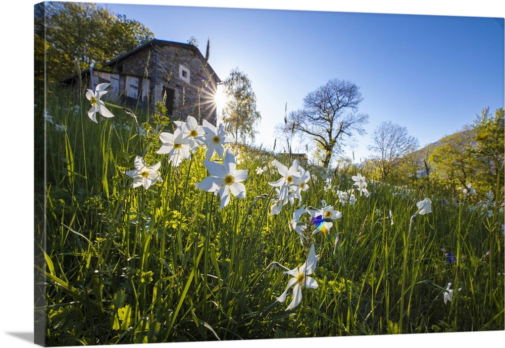 <p>Sun shines on daffodils in bloom on green fields of the Orobie Alps, Dossa, province of Sondrio, Valtellina, Lombardy, Italy</p>