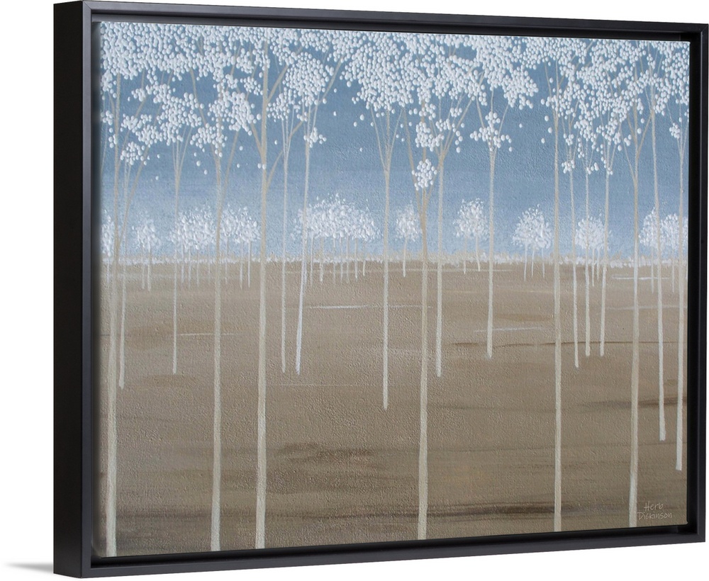 <p>Minimalist painting of tall Spring trees with white blossoms.</p>