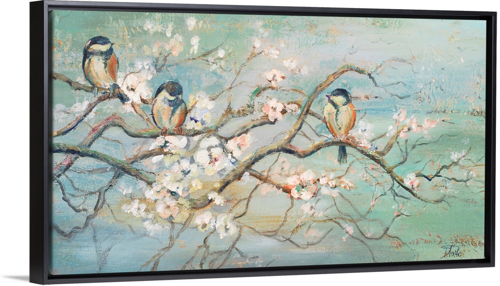 <p>Contemporary art of three Blue Tits on a flowering branch.</p>