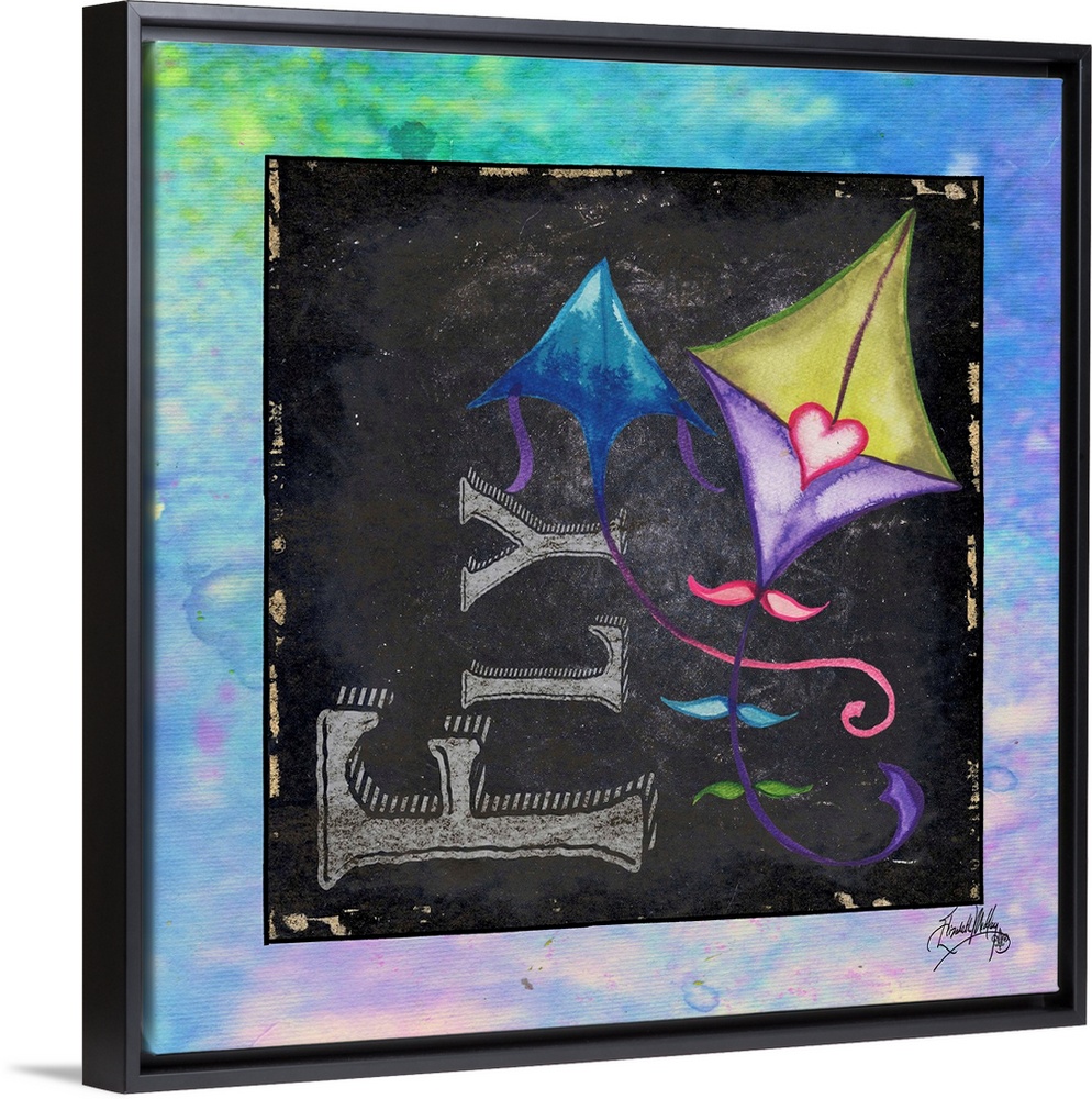 <p>Square painting with a blue, green, and purple designed background and a black chalkboard square in the middle with the word "Fly" written in chalk and two kites next to it.</p>