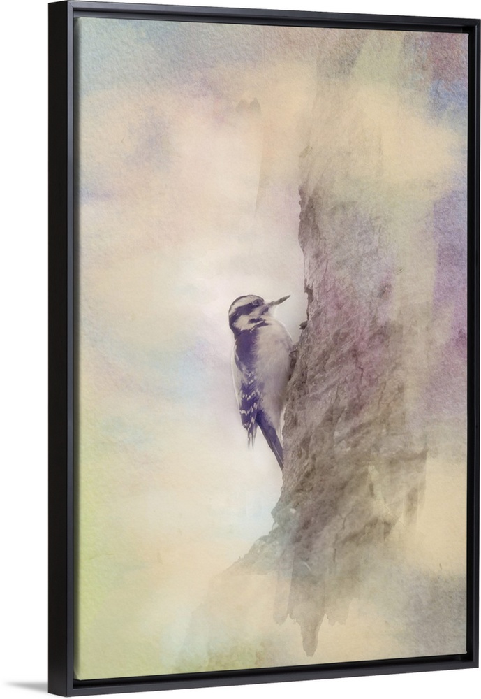 <p>Painterly photo of a downy woodpecker on the trunk of a tree.</p>