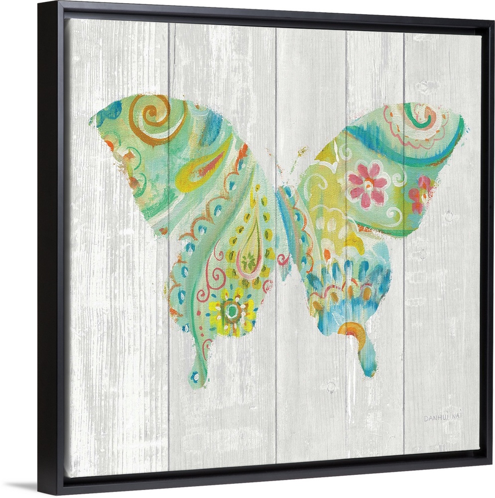 <p>Colorful paisley patterned butterfly against a white washed wood plank background.</p>