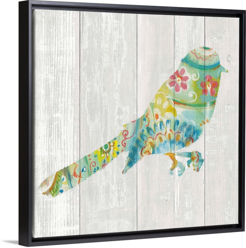<p>Colorful paisley patterned bird against a white washed wood plank background.</p>