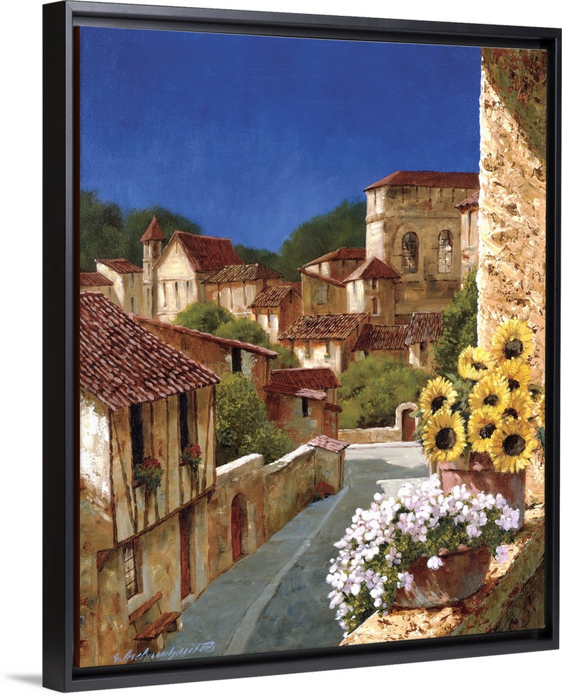 <p>A vertical complementary painting of buildings of stone and terracotta in a village in Europe.</p>