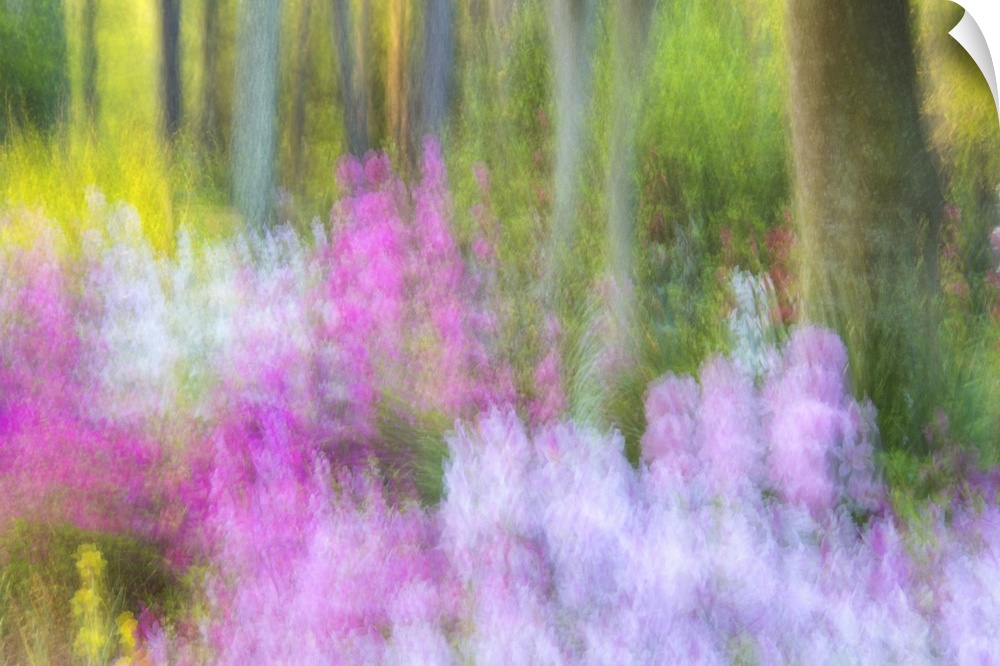 <p>Blurred motion image of bright pink and lavender flowers blossoming in Charleston, South Carolina.</p>