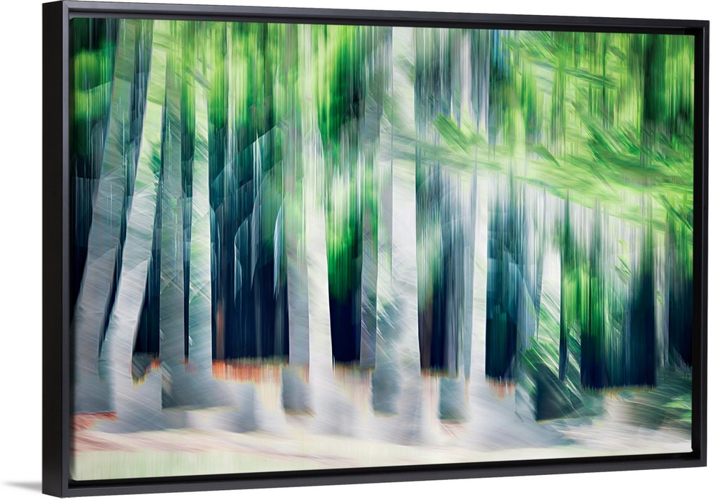 <p>A number of silvery trees with green foliage on the dark backdrop of a hillside. The image was made using the in-camera burst multiple exposure + ICM (Intentional Camera Movement) technique. The purpose is to make a picture that represents what a wooded area feels like in Spring. Ursula Abresch Spring Collection.</p>